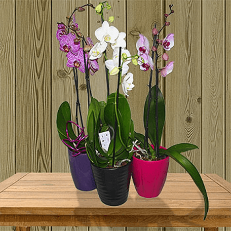 Um vaso cerâmica com orquídea Phalaenopsis.